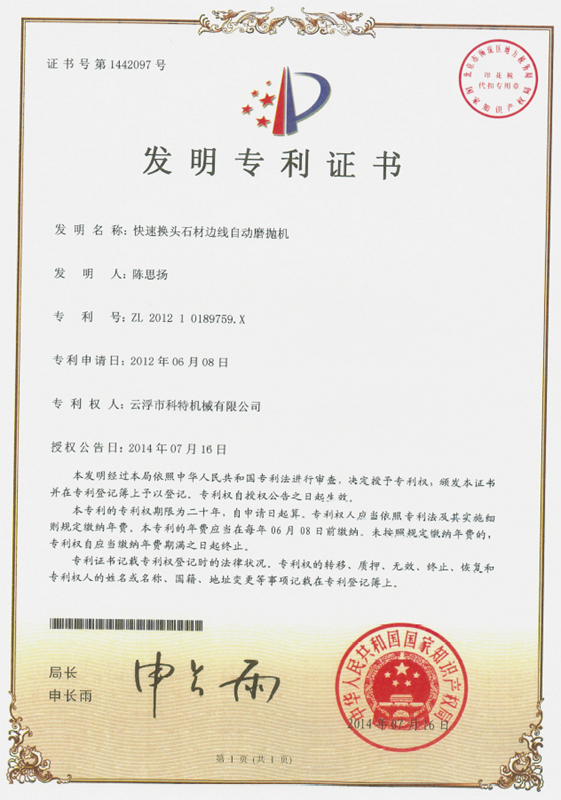 企業(yè)組建了“云浮市石材機械裝備工程技術研究開發(fā)中心”,并與高校和科研院所密切合作,致力于光機電一體化產(chǎn)品的研發(fā)、生產(chǎn)、銷售和服務。主要產(chǎn)品有框架鋸、全自動連續(xù)磨拋機、橋式自動切割機、全自動仿形石線機、數(shù)控金剛石繩鋸、裁切機等。產(chǎn)品具有自動化程度高、加工精度高和生產(chǎn)效率高等特點。產(chǎn)品除國內銷售外,還出口到歐美、東南亞、韓國、印度、中東、非洲、俄羅斯、澳大利亞等國家和地區(qū),深受用戶好評!皹蚴阶詣忧懈顧C”被認定為廣東省高新技術產(chǎn)品,擁有發(fā)明專利1項、實用新型專利1項。